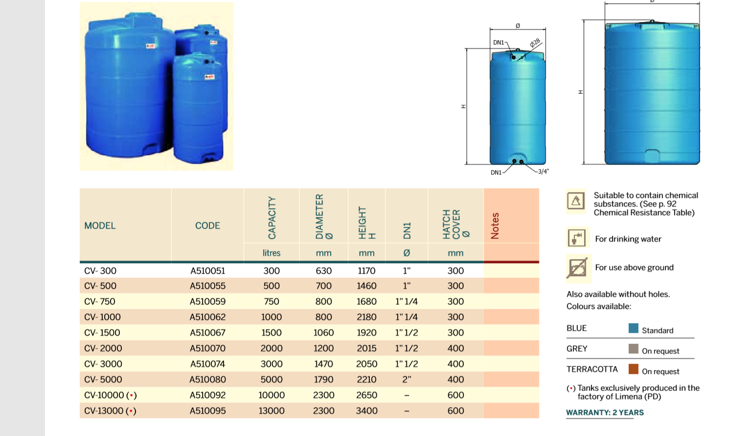 - Volymer: 300, 500, 750, 1000, 1500, 2000, 3000, 5000, 10000 och 13000 liter