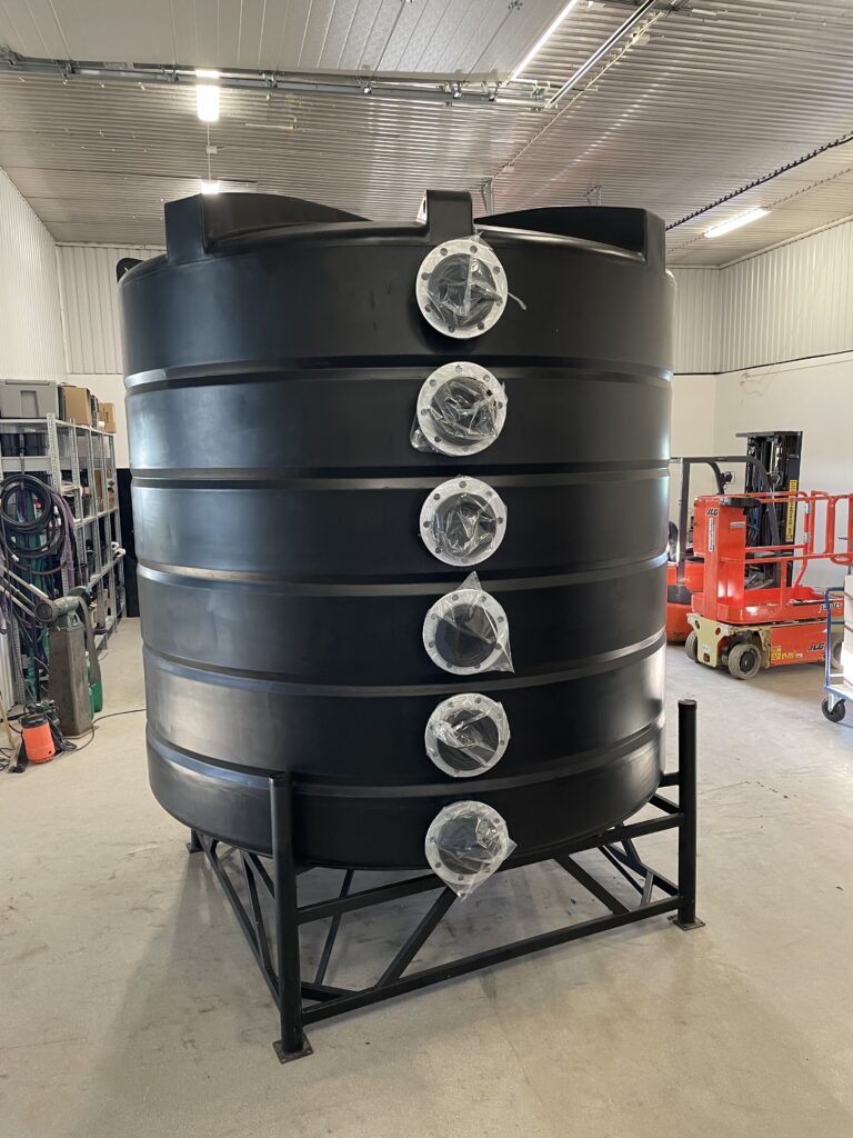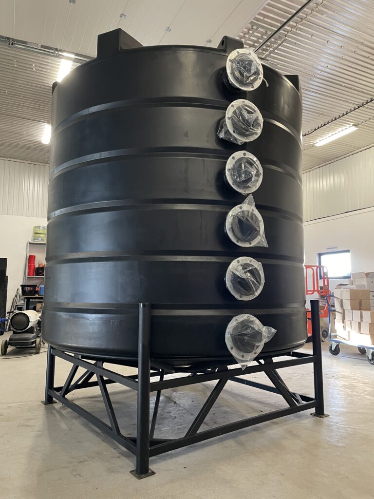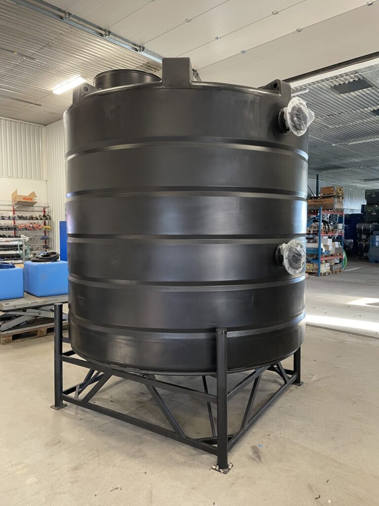 Lagringstank för flytande gödning och vatten, volym på 10 000 liter levererad till ett bolag som monterar och projekterar växthus / inomhusodlingar. Lagringstanken är placerad på ett ramverk och en 15 grader vinklad botten. Vi har utrustat tanken med DN150 flänsade anslutningar samt ventilationsrör PE 200 mm.